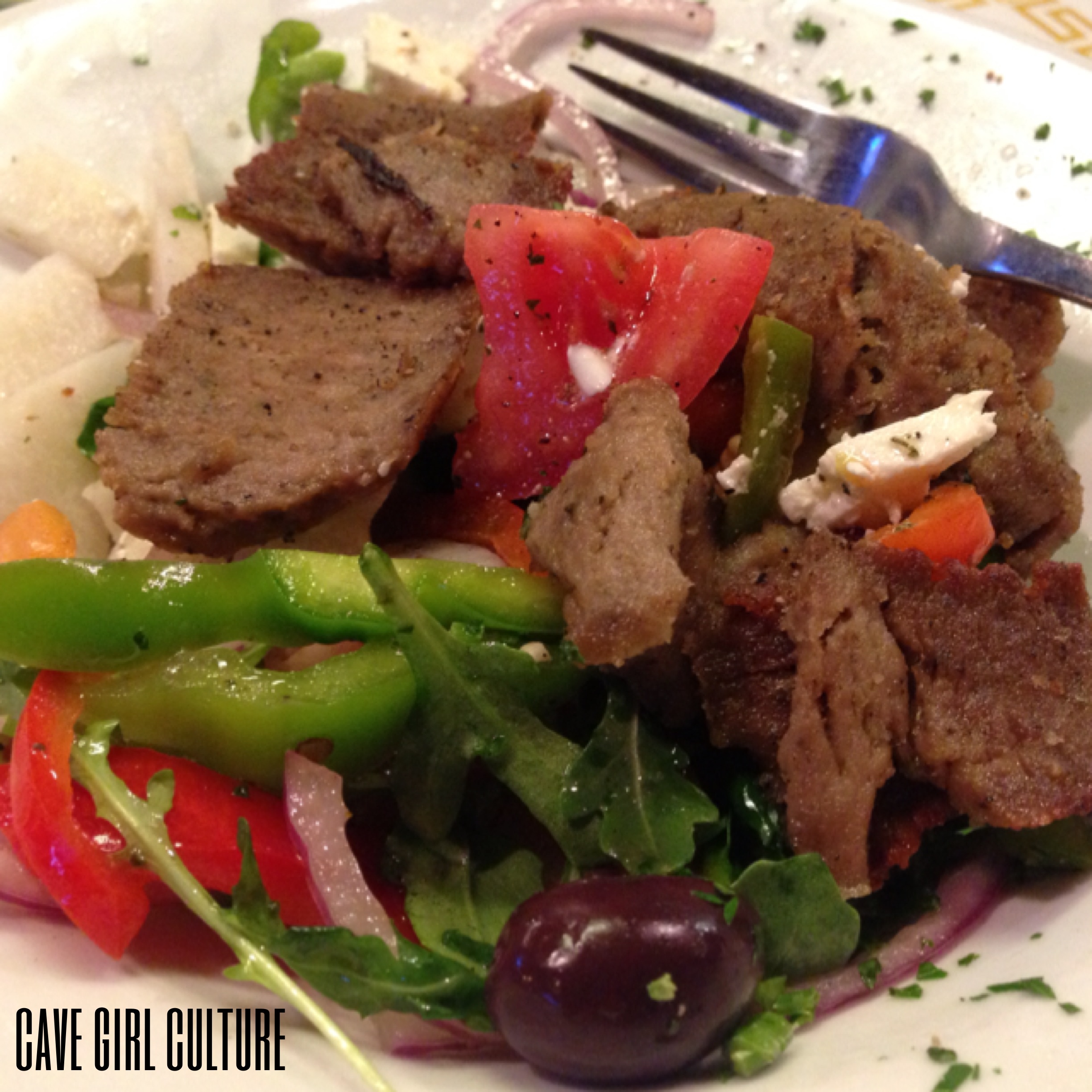 Unfortunately, we had to leave Cave Dog at the house for dinner downtown at our favorite Greek spot, Demitri’s Taverna. If you ever find yourself in the Livermore area of California, you have to stop here. It’s on the top of my list of Paleo-friendly eateries in the area and has such a great, fun vibe. Plus they give you shots of Ouzo if you sit at the bar. Need I say more?