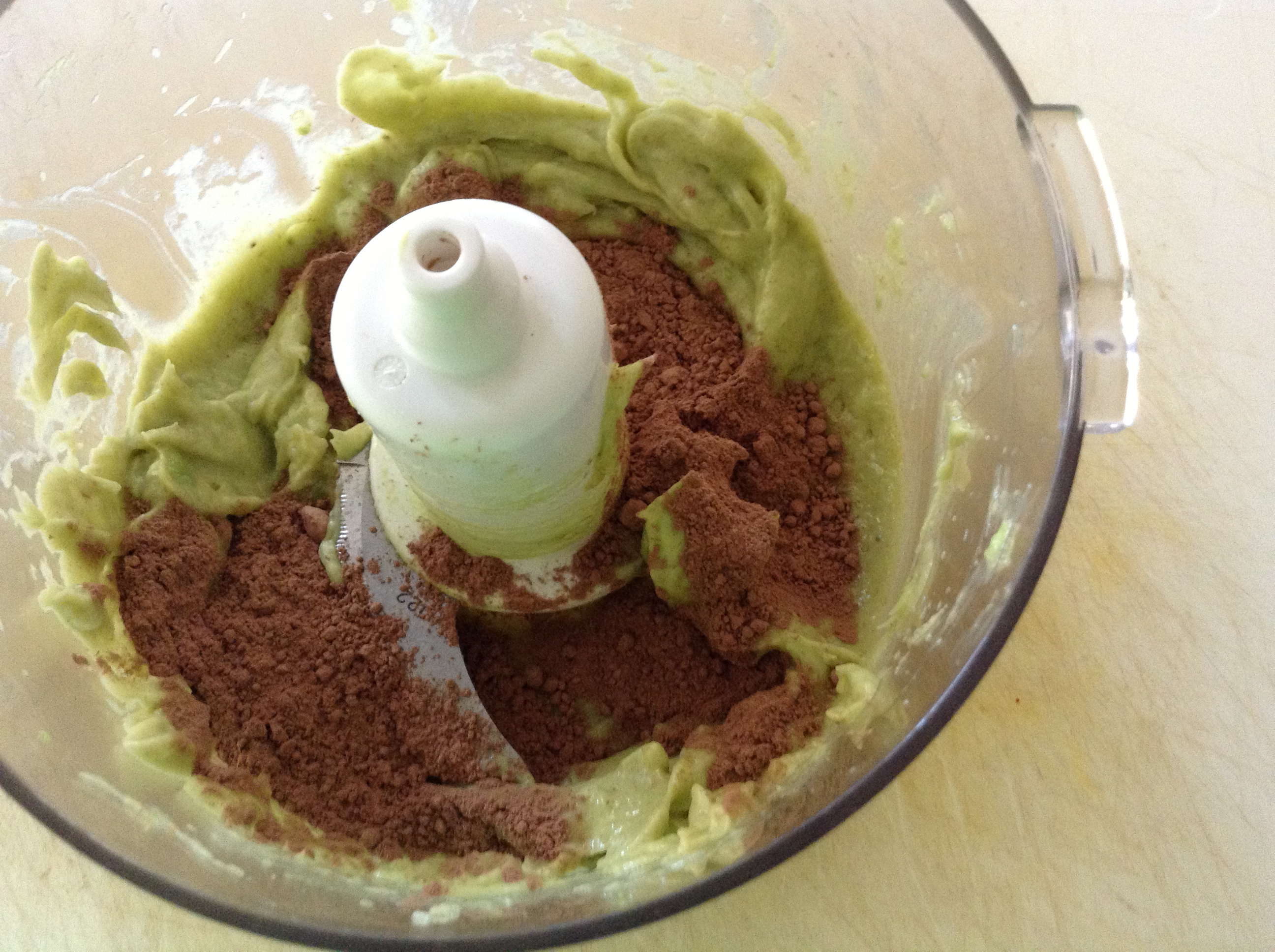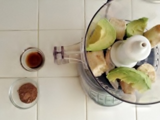 Break the banana into smaller pieces, and spoon out the avocado flesh from the skin. Add these ingredients into the food processor and blend until completely smooth. Add the remaining ingredient(s) and blend until the pudding reaches a dark brown color.