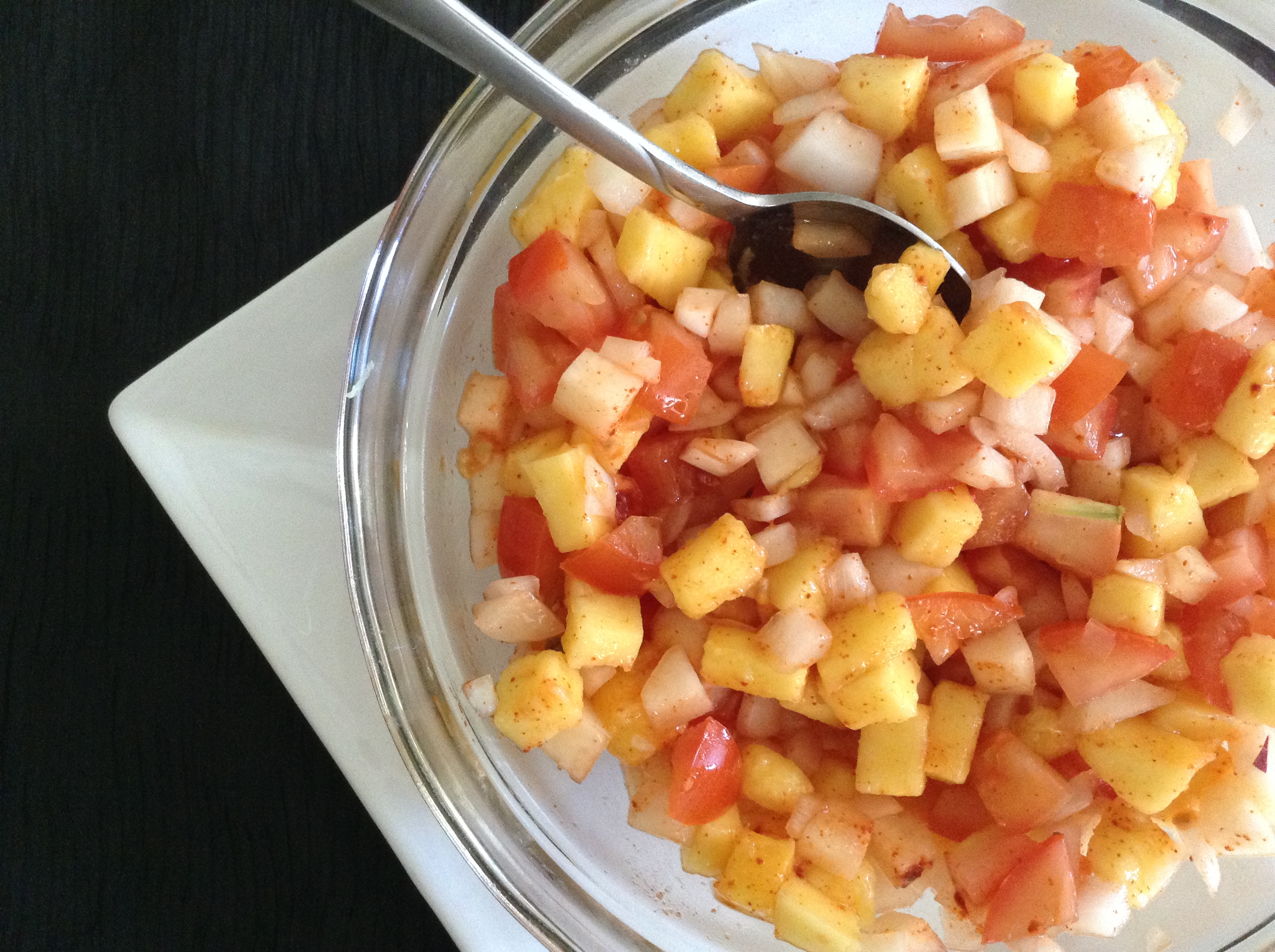 While the fish is baking, prepare the salsa. First, start with the mango, If you’re like me, you’ve been cutting mango wrong for years. Which is why it always turns into a slippery mess of unrecognizable strips . But have no fear! Google is an amazing tool. Check out this handy dandy tutorial on the proper (and easy) way to get mango off the fruit and into your mouth bowl. Once you have the mango separated from the flesh, be sure to dice into smaller pieces. Dice the peach, onion, and tomatoes and mix in a bowl with the mango. Add the seasonings and juice from one lime. Toss gently and let refrigerate until the fish is done baking.