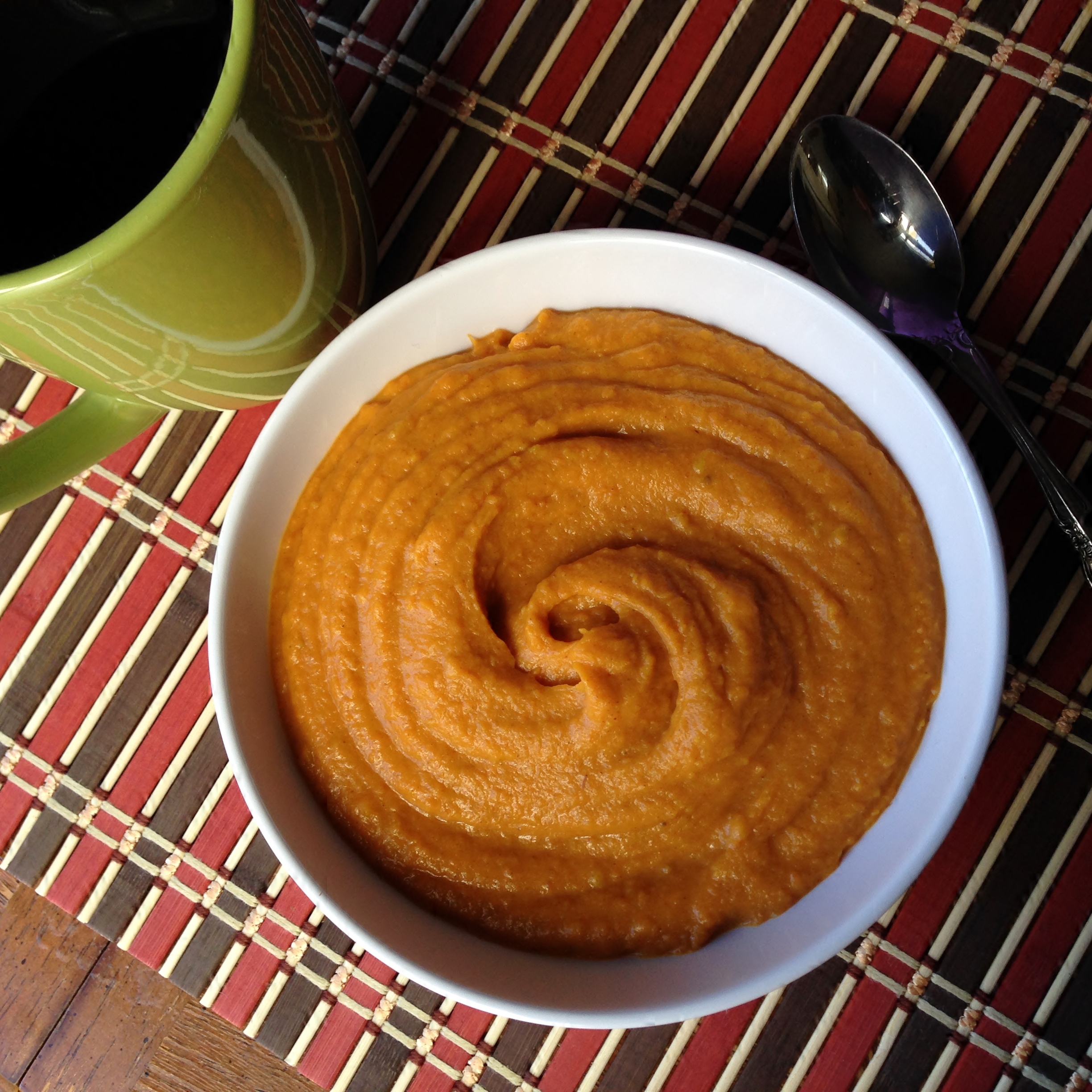 When the body goes through a traumatic event such as surgery, it needs rest and nutrition to heal properly. I’ve got the rest part down, but the nutrition part has been a little more difficult for me. I’m on my periodontist’s orders not to eat any solids for at least 3 days. Bah. I get grumpy when I can’t eat food. Determined not to succumb to a weekend of coconut ice cream and fruit smoothies (can you say sugar high?), I asked my Facebook followers for a few suggestions on puréed soups. After receiving some good tips and considering the contents of my refrigerator and pantry, I decided to go for a curried sweet potato and apple soup. I can’t tell you how badly I wanted to throw bacon in this soup, but I was all out, and driving while on Norco is not recommended. I’ll survive.