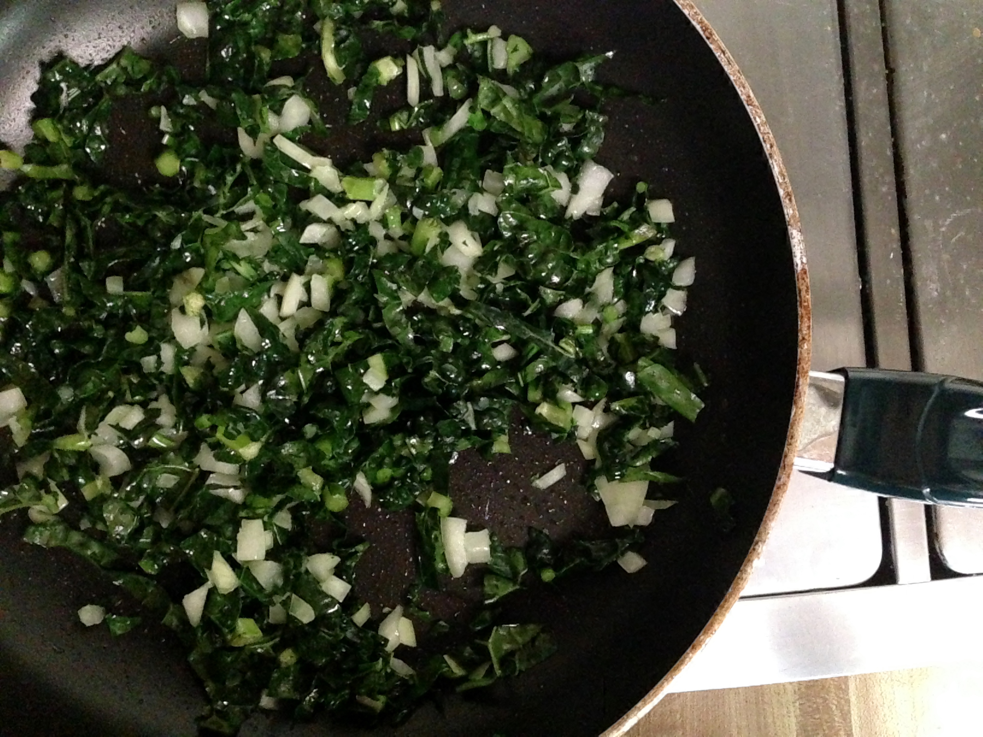 Heat the coconut oil in a skillet over low heat and prepare your produce. Cut the kale into long strips or shred into small pieces and dice the onion, then add to the warm oil and sauté for a minute or so.