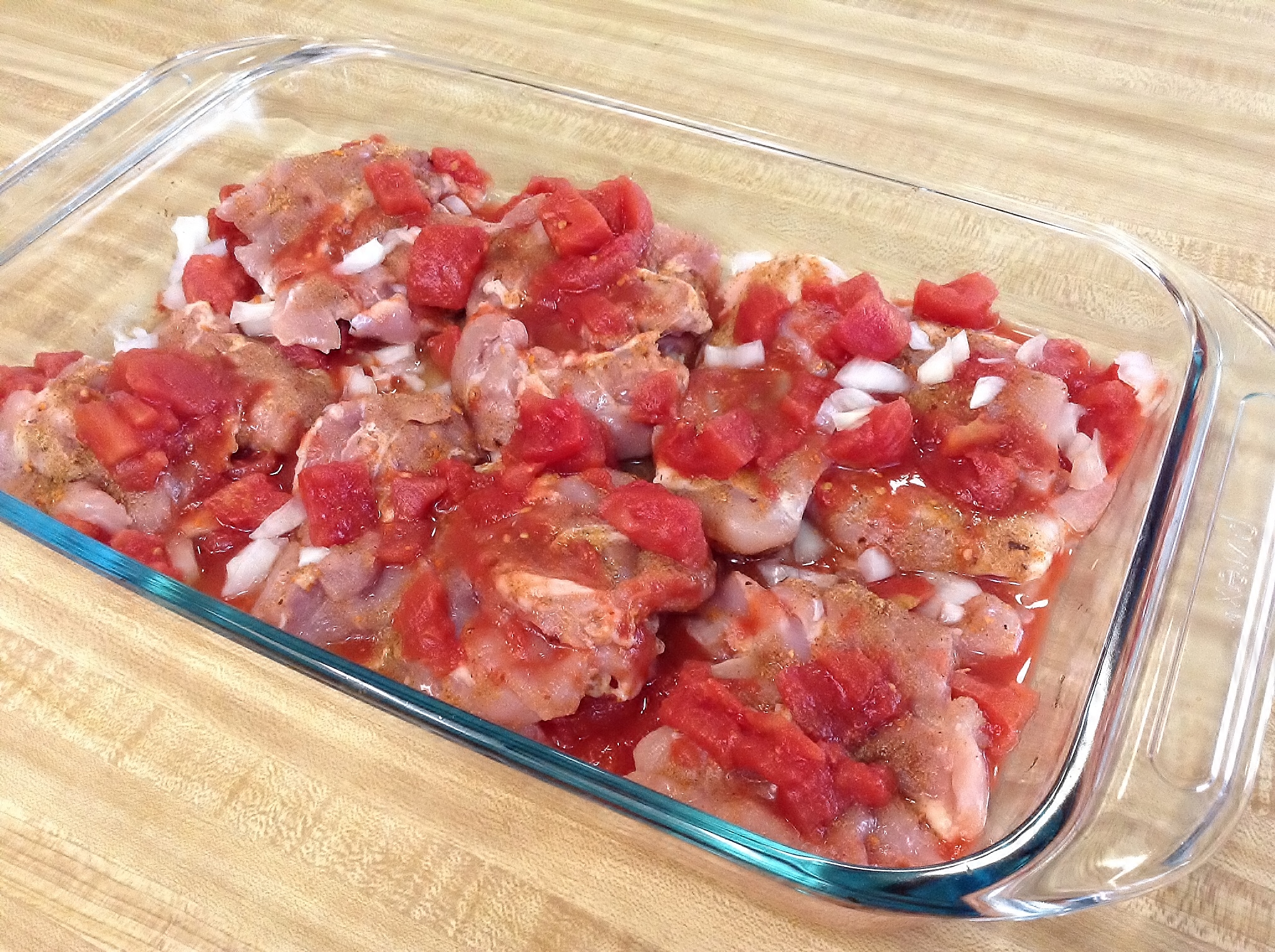 pen the can of diced tomatoes and pour out half in your baking dish. Place the chicken thighs over the diced tomatoes and then pour the rest over the chicken. Doesn’t that look pretty? Pretty delicious.
