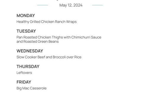 This week's meal plan includes Healthy Grilled Chicken Ranch Wraps, Pan Roasted Chicken Thighs with Chimichurri Sauce, Slow Cooker Beef and Broccoli, and Big Mac Casserole. A note suggests doubling the recipe for extra meat. Enjoy these delicious recipes and have a great week!