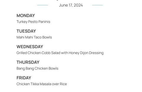 This weekly meal plan offers a variety of simple and delicious recipes: Monday: Turkey Pesto Paninis Tuesday: Mahi Mahi Taco Bowls Wednesday: Grilled Chicken Cobb Salad Thursday: Bang Bang Chicken Bowls Friday: Chicken Tikka Masala over Rice Each dish comes with helpful notes and tips. Enjoy these tasty meals throughout the week!