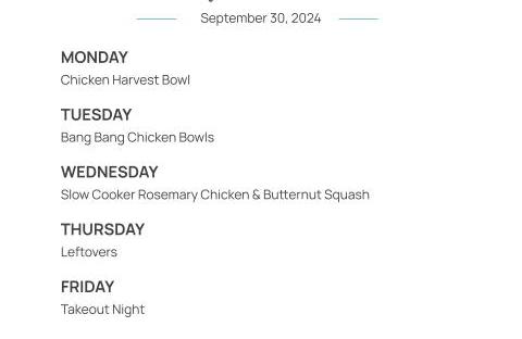The meal plan is shared a bit late due to technical issues, featuring various dishes for the week. Highlights include Chicken Harvest Bowls and a favorite fall recipe, Slow Cooker Rosemary Chicken & Butternut Squash, which can be made healthier by reducing butter. Leftovers and takeout are planned for later in the week.