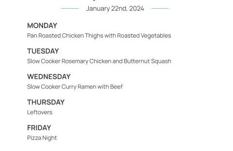 This week's meal plan features a variety of recipes: Brazilian Prawn Soup on Monday, Slow Cooker Honey Garlic Chicken & Veggies on Tuesday, leftovers on Wednesday, Thai Red Curry Dumpling Soup on Thursday, and Sheet Pan Hot Honey Chicken & Brussels Sprouts on Friday. Enjoy the meals!